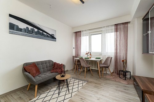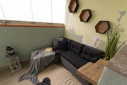 Velkým benefitem je prostorný zasklený balkón (5 m2), která rozšiřuje obytný prostor a nabízí příjemné místo jak pro ranní kávu, tak pro večerní sklenku vína u které si užijete hezký výhled z vyššího patra.