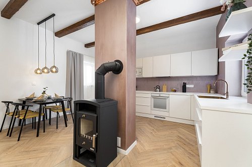 Velkou výhodou je moderní podlahové vytápění napojené na tepelné čerpadlo Sinclair, které v zimě příjemně hřeje a v létě dokáže také chladit. Atmosféru domova doplňují krbová kamna, která mohou posloužit i k přitopení. V bytě je k dispozici optické připojení k internetu, ideální pro práci z domova nebo online výuku. K bytu patří vlastní parkovací místo, což je velká výhoda.