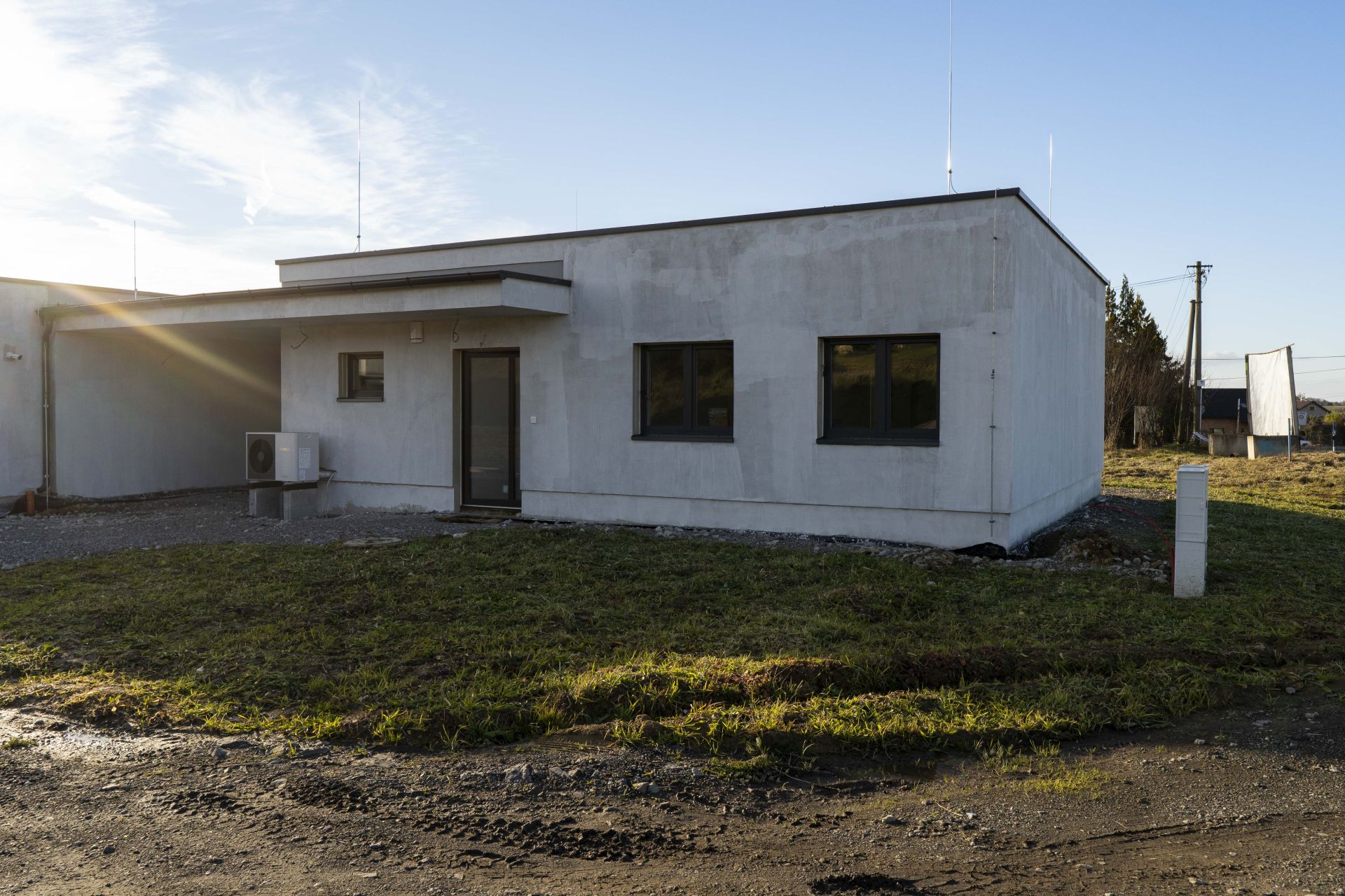 Stavba je z keramických tvárnic tl. 30 cm, zateplená polystyrenem o tloušťce 16 cm. Dům má plochou střechu z předpjatých stropních panelů s vakuově kotvenou PVC krytinou. Nechybí silikonová fasáda, plastová okna s trojsklem a hliníkové vstupní dveře. Vytápění zajišťuje kvalitní tepelné čerpadlo Vaillant napojené na teplovodní podlahové topení v anhydritové vrstvě. Dům patří mezi poslední v lokalitě, které mají zajištěné napojení na veřejnou kanalizaci. Projekt počítá s možností instalace fotovoltaického systému a dům je na tuto technologii stavebně připraven.Celková plocha je 90 m². Užitná 78 m².
